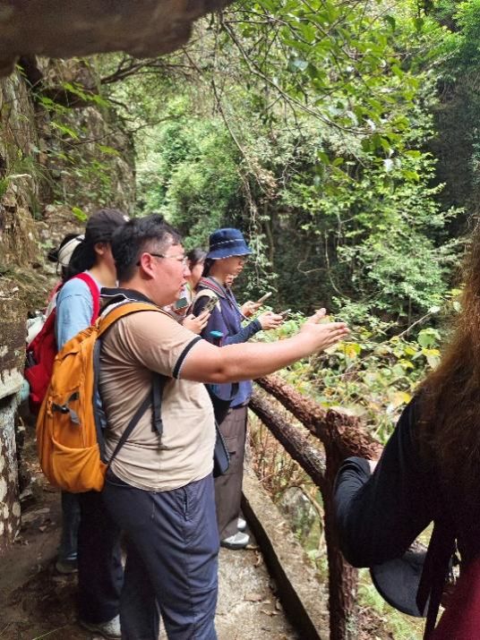 10月24日上午,同学们前往南雄梅关古道,行走于由鹅卵石与片石铺就、条状花岗岩固边的古驿道,认真聆听讲解员述说梅关古道的千年历史。历经半小时的路程,同学们来到位于梅岭山巅的雕刻着“南粤雄关”的关楼处,其以“一山隔断南北天”的气势,耸立于主岭分水界上。继续沿古道向前走,同学们便来到一山之隔的江西赣州。老师安排同学们使用罗盘测量岩层的走向、倾向、倾角,以此巩固提升大家的野外勘察能力。