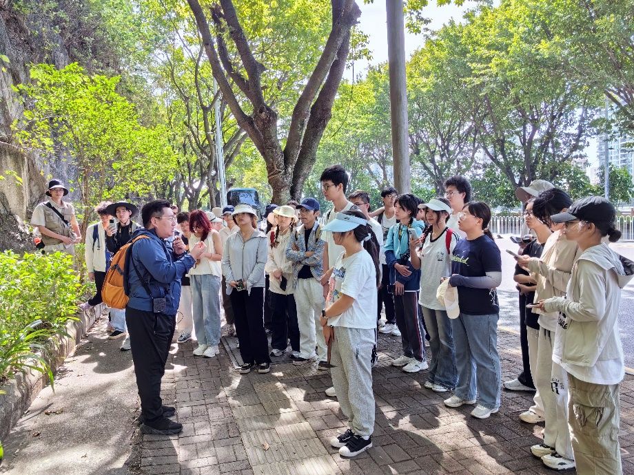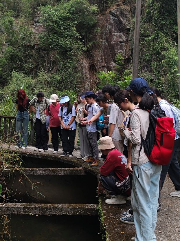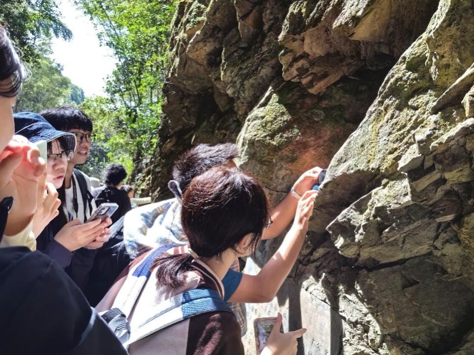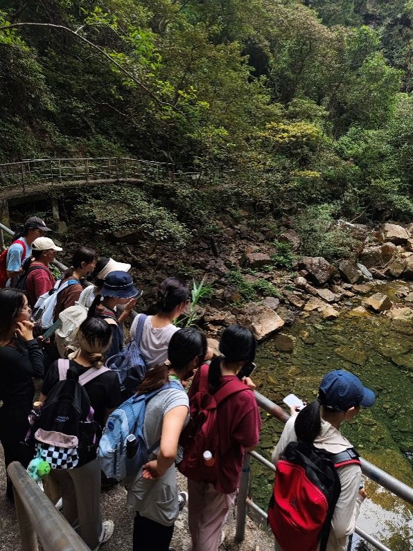 在大峡谷谷底的路线中,老师对河流的叠瓦状构造等现象进行分析讲解,同时教授同学们如何通过河道内岩石的特征判断河流流向。在通天梯的千米游廊处,老师为同学们讲解周边岩石的类型和属性特征,并联系地质因素分析广东大峡谷的发育状况及成因。在此期间,同学们结合实践进一步学习地壳运动和地质变迁。