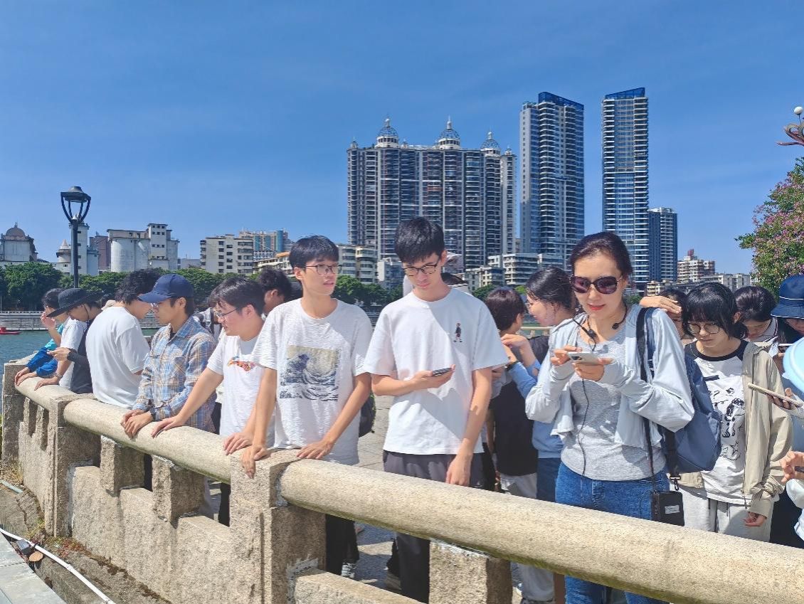 10月23日中午,实习队伍来到武江、北江和浈江三江交汇处。老师带领同学们辨认三江的各自方位,介绍了三江的流经范围,引导同学们根据河网水系的特征分析三江的差异并解释了洪涝灾害中的“洪”与“涝”的区别,由此引出三江对应的特点和需要应对的灾害,同时,老师讲解了三江的横断面的不同形态,推断分析三江周边地区的受灾概率。