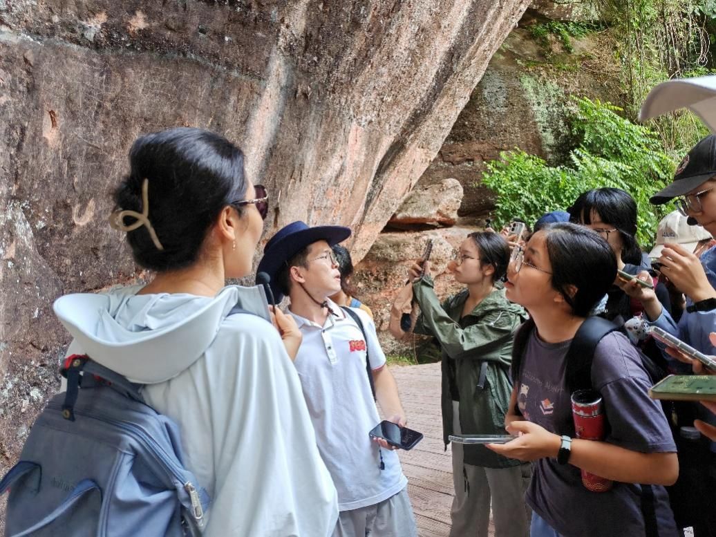 参观完博物馆,实习队伍来到长老峰脚下。沿着地质长廊,老师向同学们介绍流水侵蚀和风化作用共同作用下丹霞地貌的形成与演化,并结合生物因素、水文因素分析山体表面特征的产生。此外,老师也讲解了砾岩中蜂窝状洞穴形成的原因、梦觉观中的结皮风化、巷谷的发育等内容。在讲解的过程中,老师适时提出问题引导同学们深入思考,激发了同学们对自然地理现象的热烈讨论。