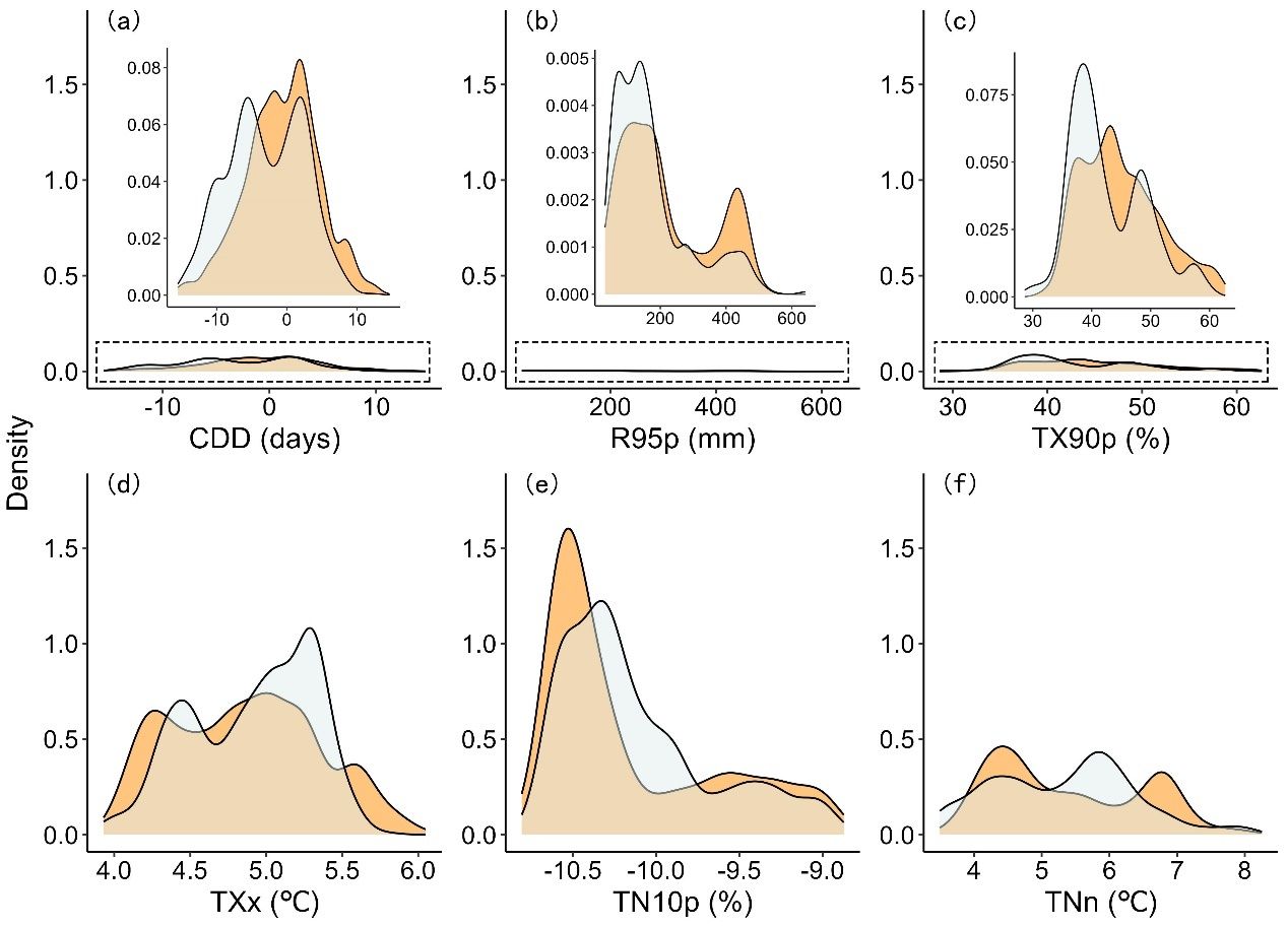 图4:在SSP5-8.5情景下,物种丰富度高风险区内极端气候事件变量的变化分布密度图。(a) 为CDD, (b) 为R95p, (c) 为TX90p, (d) 为TXx, (e) 为TN10p, (f) 为TNn。