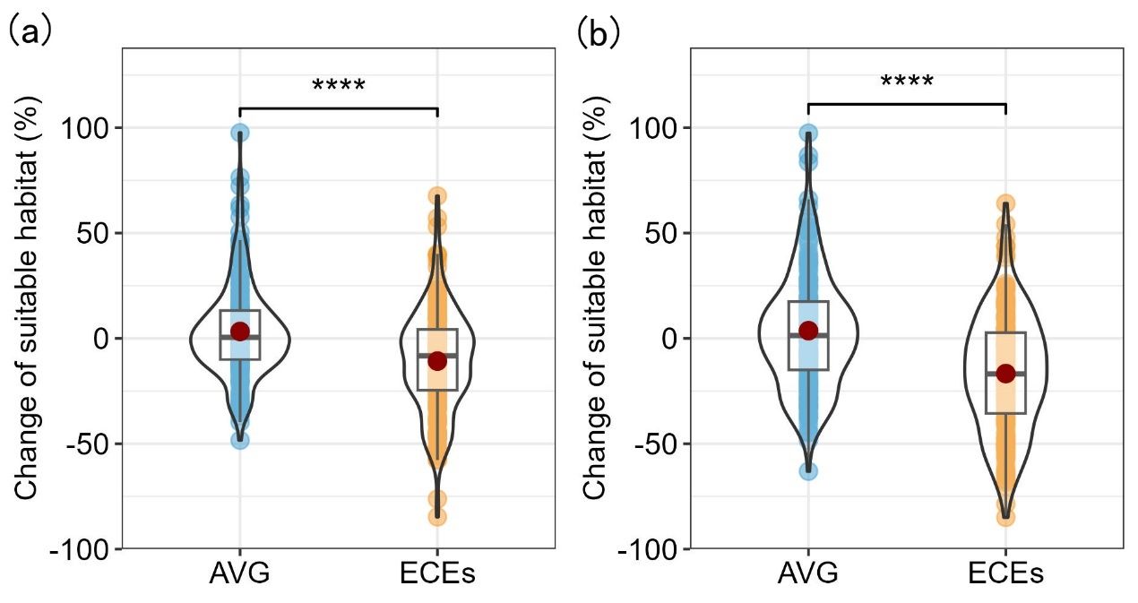 图1:在平均气候态(AVG)和极端气候事件(ECEs)下,189个杜鹃花物种潜在适生区面积到2100年的变化。(a,b)分别表示SSP2-4.5情景和SSP5-8.5情景。学生配对t检验评估平均气候态与极端气候事件之间的统计差异(*p < 0.05;**p < 0.01;***p < 0.001;****p < 0.0001)。