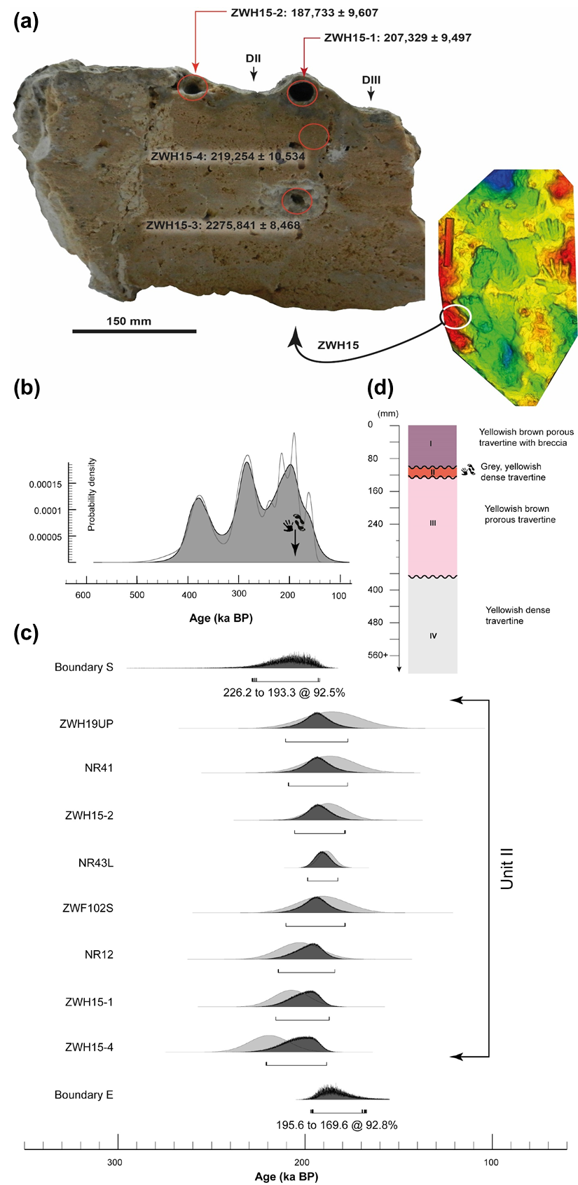 通过对这些手脚印进行3D建模(图3)和形态学定量分析,并结合现代人手脚印解剖学特征推测,文章认为它们是在泉华没有成岩之前由古人类压上去的,而且很可能是两个孩童。他们或许在温泉边的软泥中嬉戏,觉得软泥中自己的印迹非常有趣,从而有意识地创作出世界上最古老的原始艺术。对手脚印所处钙华层及附近多次取样并反复进行U-Th定年,结果(图4)表明这块艺术岩板表层U-Th年龄为距今约16.9-22.6万年,其中还包含了一个手指印的直接测年年龄(约18.7-20.7万年)。