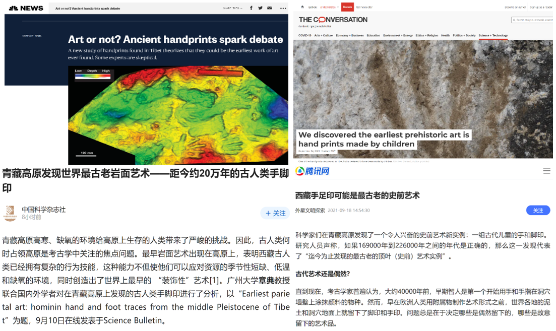2021910日,万象城官网章典教授领衔的国际团队在高水平期刊《Science Bulletin》(JCR一区,最新影响因子为11.78)在线登载题为《Earliest parietal art: hominin hand and foot traces from the middle Pleistocene of Tibet》的文章。章典教授为第一作者兼共同通讯作者,讲师王蕾彬博士、张盛达博士,研究生王晓晴,博士后李腾博士以及院长吴志峰教授为共同作者。文章目前处于期刊预较样阶段,尚未正式发表,即迅速在国内外引起广泛关注(图1)。至今,网络上已有中、英、法、德、西、意、俄、日等多国文字的报道或解读,雅虎、NBCAAAS等知名新闻媒体、学术网站均给予了相关报道或转载;中国科学杂志社、腾讯、百度、新浪、网易、搜狐等国内媒体亦对此进行了持续追踪报道。