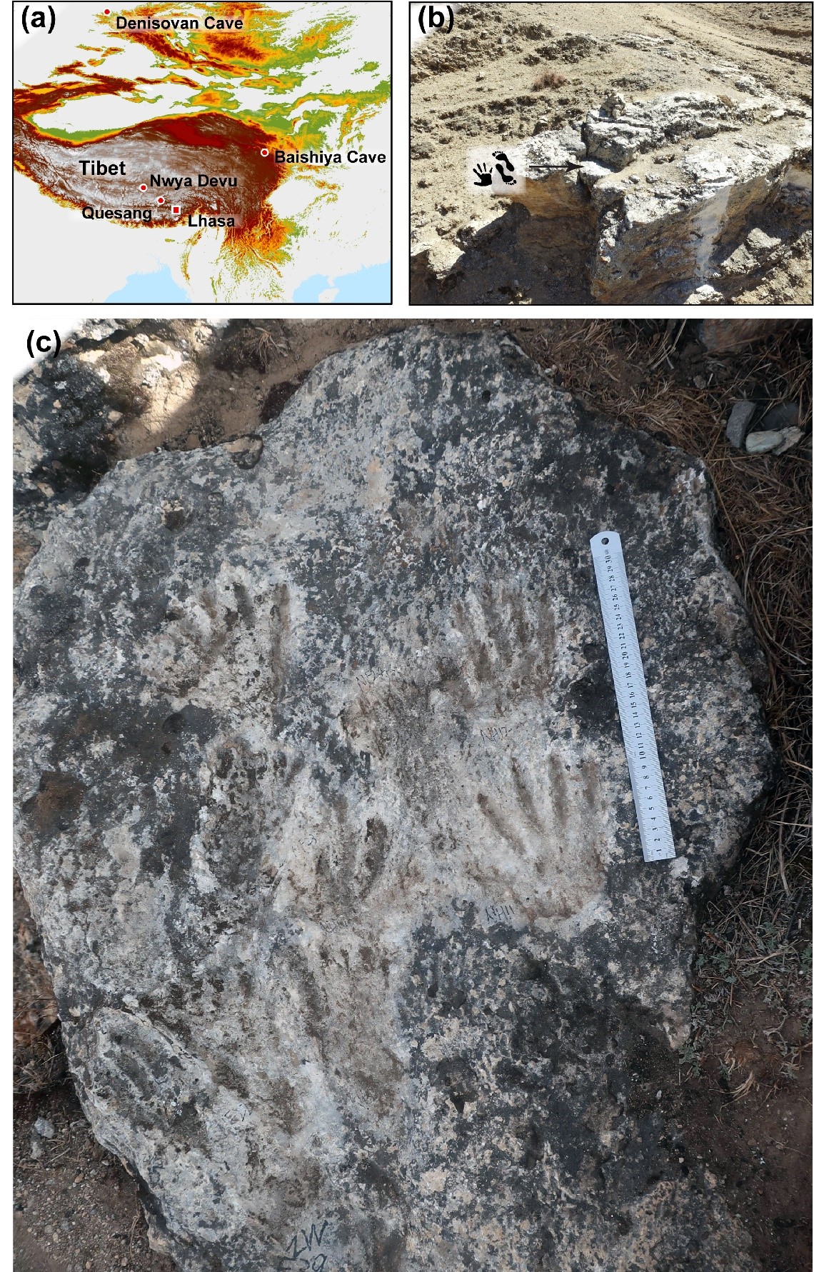2 西藏邱桑古人类手脚印遗迹。(a)区域背景显示了其它关键的古人类发现地点。(b)岩面艺术的位置背景(如箭头所示)。该遗迹处于一块突出的岩角上方,由于上覆的块体被自然移除,岩面艺术暴露在其中一个块体的表面。(c)原始岩面艺术。