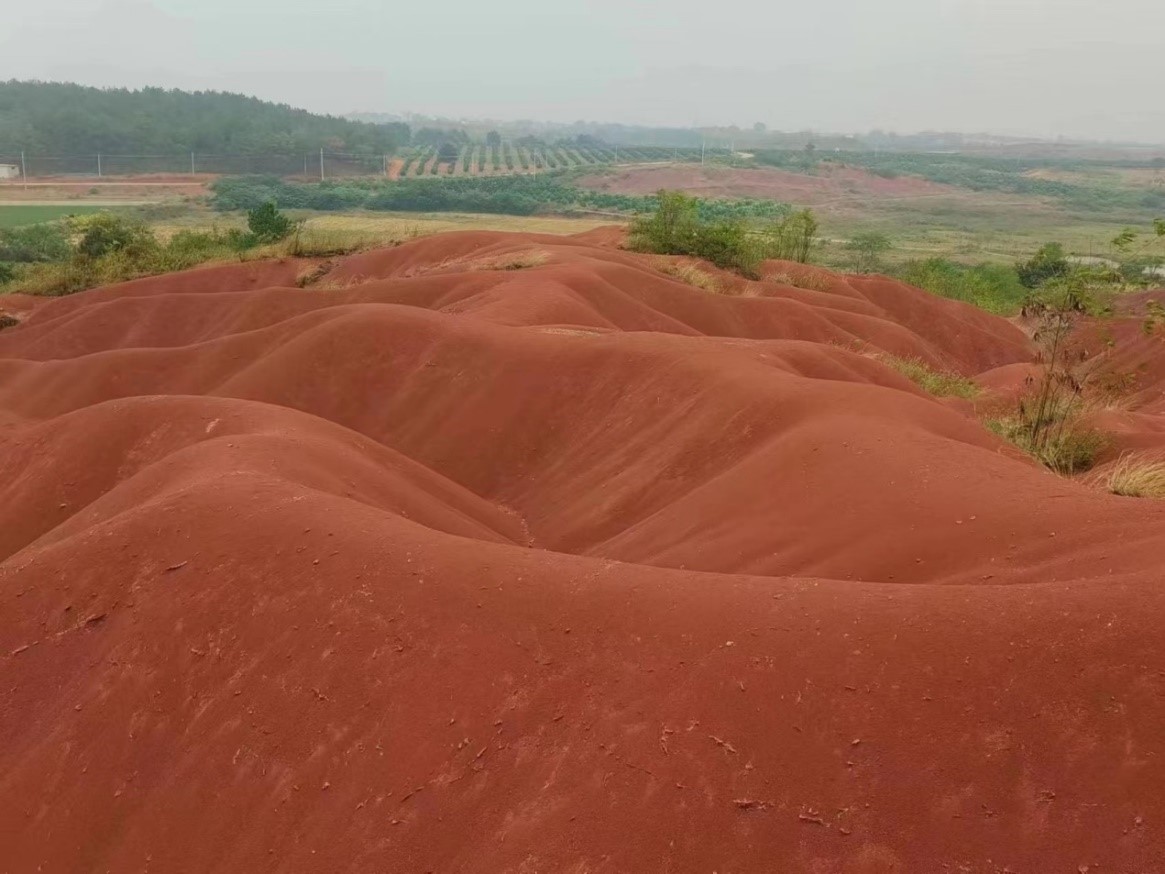 下午则来到素称“南岭红沙漠”的南雄红土层。这里属于典型的山间盆地,该处长时间受到流水侵蚀风化作用和风力堆积作用,裸露出无数个由红色砂岩和泥岩构成的紫红色丘陵。另外,许多地理研究者也曾在此发现恐龙足迹化石,其为该地生物演化和地球气候的演变提供了重要意义。