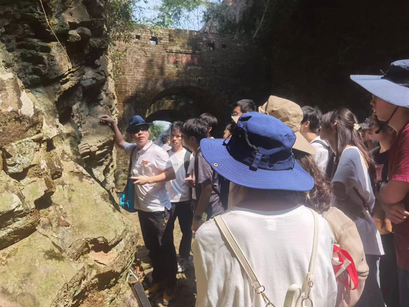 实习第四天,第一站是南雄梅关古道,其位于江西省大余县与广东省南雄市交界处。大家从来雁亭出发,沿着石头路一路向上来到岭南第一关关楼处,亲身体验一步跨过粤赣两省。同时,同学们在老师的指导下,就地测量古道两侧的岩层产状,进行罗盘的演练操作,将课堂上所学知识运用到野外实践中来。
