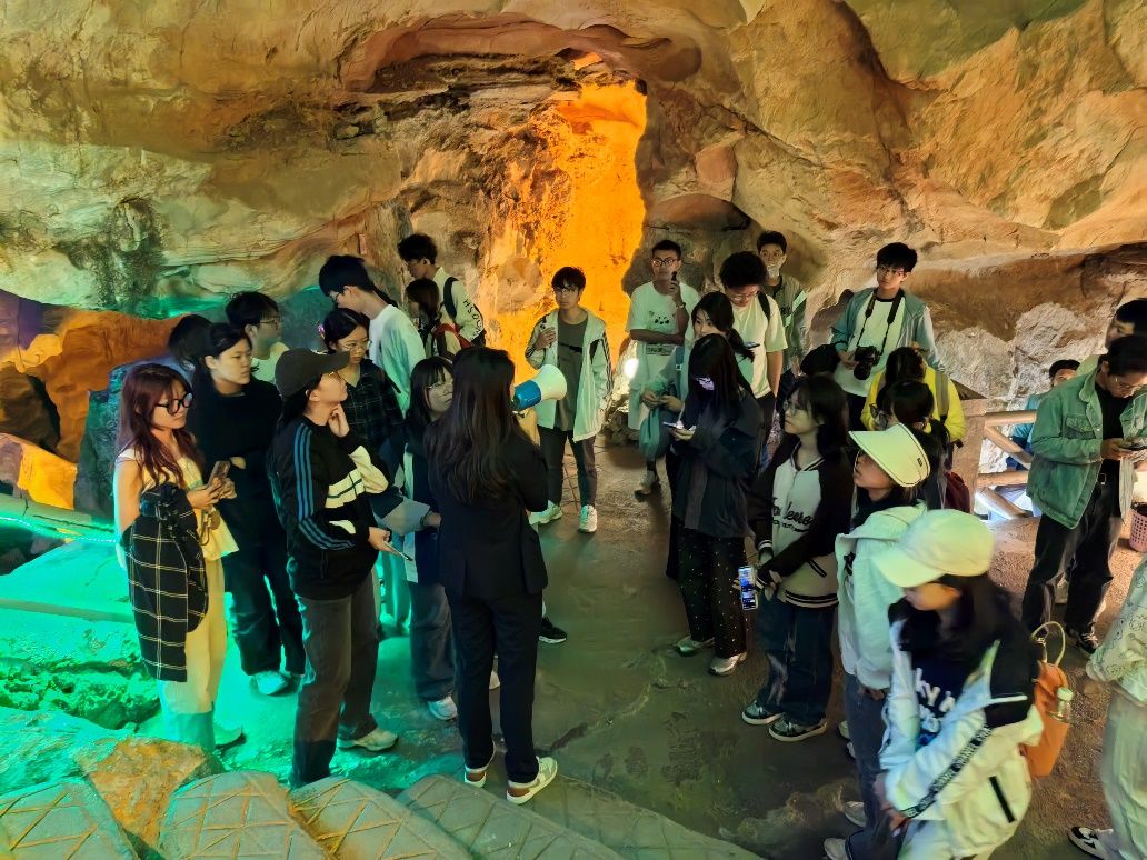 10月25日上午,老师组织同学们参观马坝人遗址。进入石灰岩岩洞内,同学们看到了马坝人头骨的出土点,向洞穴内部行进一段距离后,马坝人的复原半身像立于岩壁旁。通过讲解员的叙述,同学们了解到马坝人称为早期智人的原因以及马坝人的生活情况。跟随讲解员的脚步,同学们游览整个洞穴,领略了一番喀斯特地貌岩洞的风光。