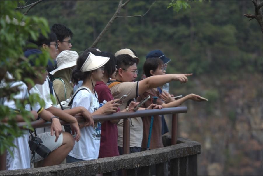 10月21日中午,师生抵达广东大峡谷并沿生态科普教育路线一览大峡谷的壮特殊自然地理环境。在路途中,老师细致讲解了广东大峡谷由于地壳运动,地壳随地块抬升,部分地块张裂下陷逐渐裂解成裂谷的过程,之后在流水侵蚀和重力崩塌等作用下形成深切河谷并不断拓宽的影响。峡谷顶端较平坦的部分被称为夷平面,其产生受地壳运动、构造抬升以及外力作用的影响。在娓娓道来的讲述中,同学们从地质、地貌、水文的视角更加深入了解广东大峡谷的整体情况。