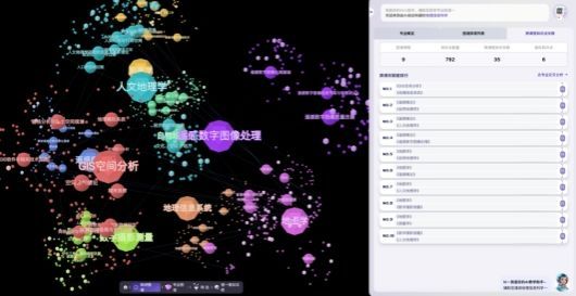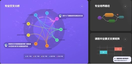 专业知识中心涵盖人才培养、课程大家族、问题图谱、知识图谱、课程思政、实践教学、专业交叉分析等特色内容。通过虚拟教研环境下的课程交叉分析应用,专业知识中心为教育教学的优化、创新以及人才培养质量的提升提供有力支持。通过对不同课程的交叉分析,可以清晰地看到各课程之间知识内容的重叠、衔接以及缺失部分。图谱可直观显示出“遥感概论”与“人文地理学”课程可能在地理空间数据处理方面存在部分重叠内容,而在地理大数据与人工智能结合应用方面可能存在课程空白,有助于老师们及时调整课程设置,避免教学内容的重复,填补知识体系的漏洞,构建更加科学、合理的课程体系与教学内容。