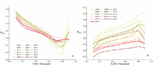 图2 (a)2005-2022年经阈值分割后的NDVI与VCD相关性变化趋势;(b)2005-2020年经阈值分割后的LST与VCD相关性变化趋势