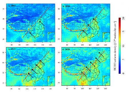 甲醛时空分布及其排放源贡献的演变对VOCs减排尤其重要。中国对流层甲醛的长时序演变特征及社会-自然排放源对甲醛排放的贡献演变仍不明确。