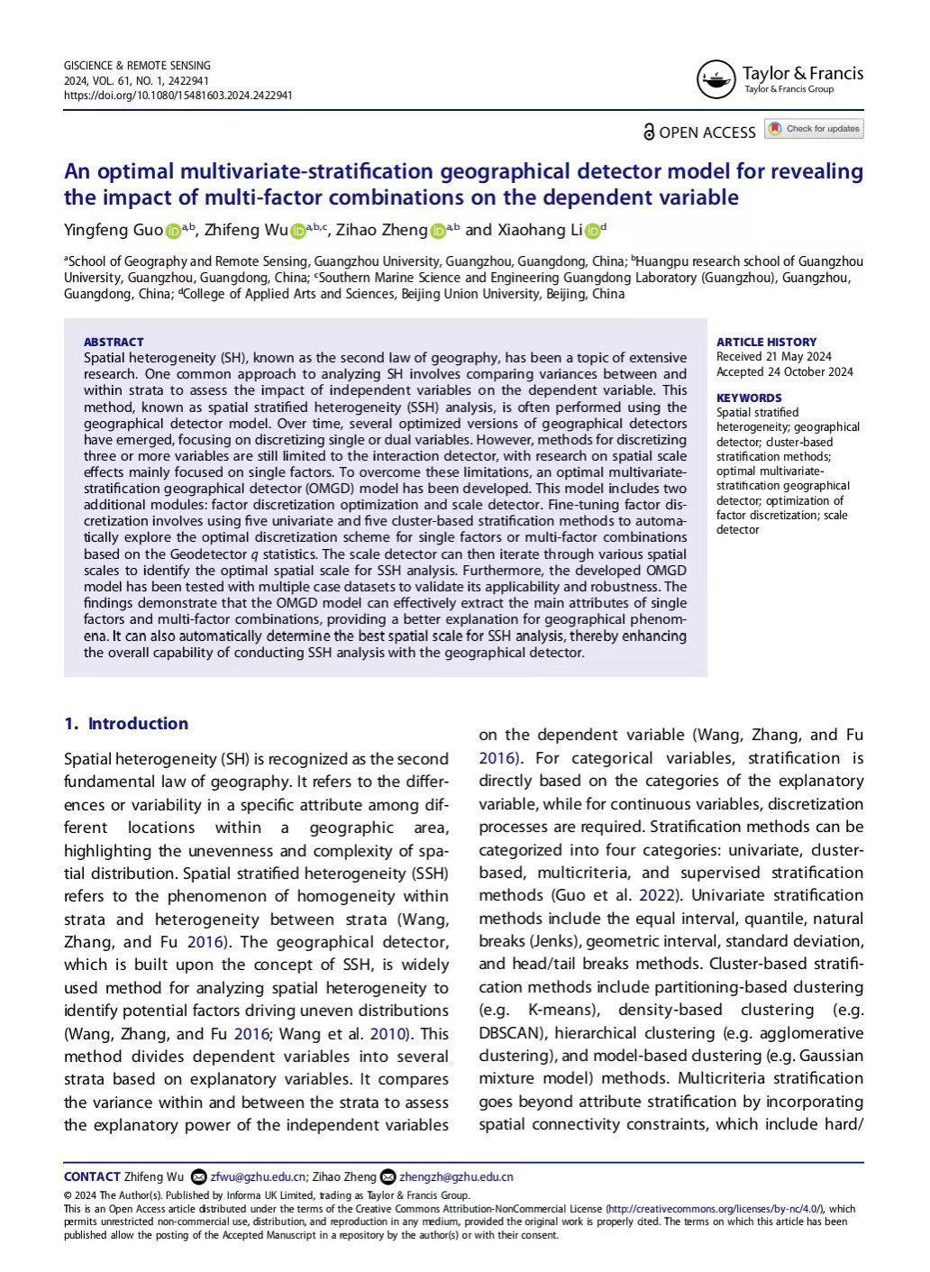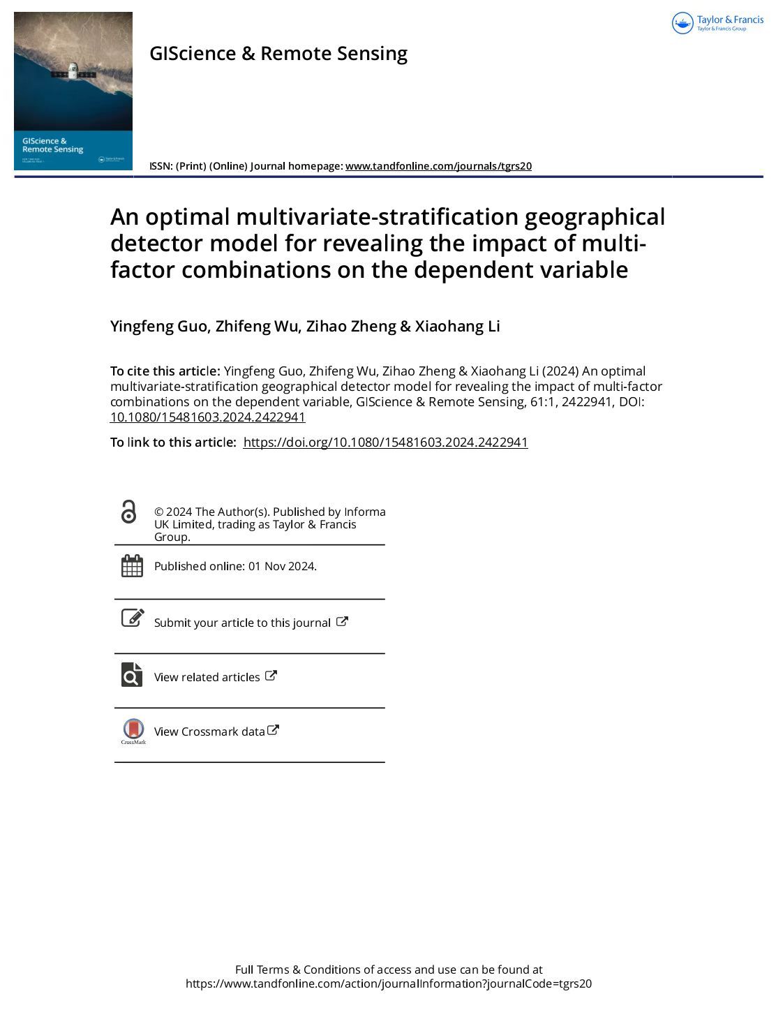allwincity万象城官方网站地理科学与遥感学院吴志峰教授和郑子豪副教授指导硕士研究生郭颖锋在地理信息科学领域权威期刊GIScience & Remote Sensing发表题为“An optimal multivariate-stratification geographical detector model for revealing the impact of multi-factor combinations on the dependent variable”的研究成果。