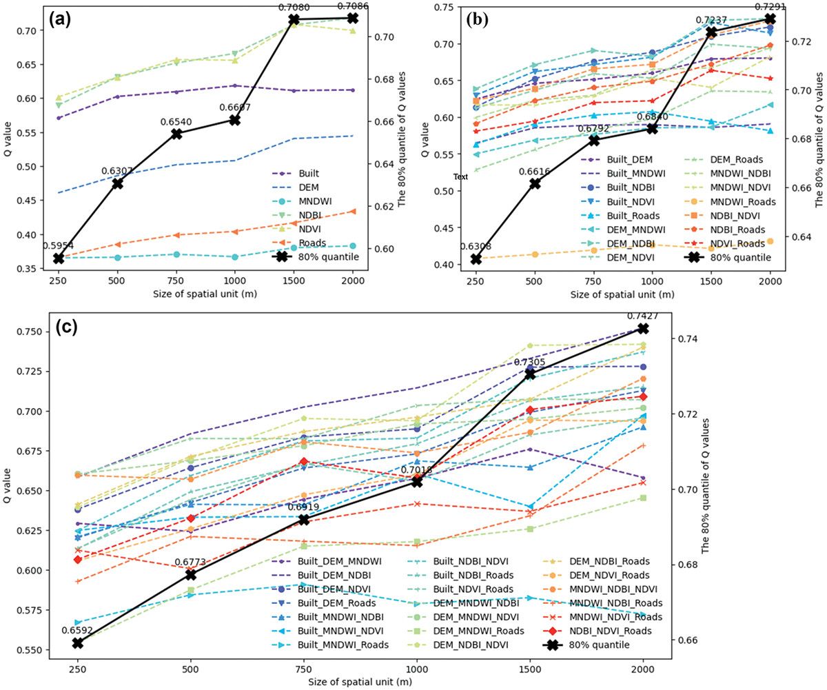 图2 基于深圳市地表温度变量的q 值 80% 量化值的尺度探测器结果(a)单因子、(b)双因子组合和(c)三因子组合