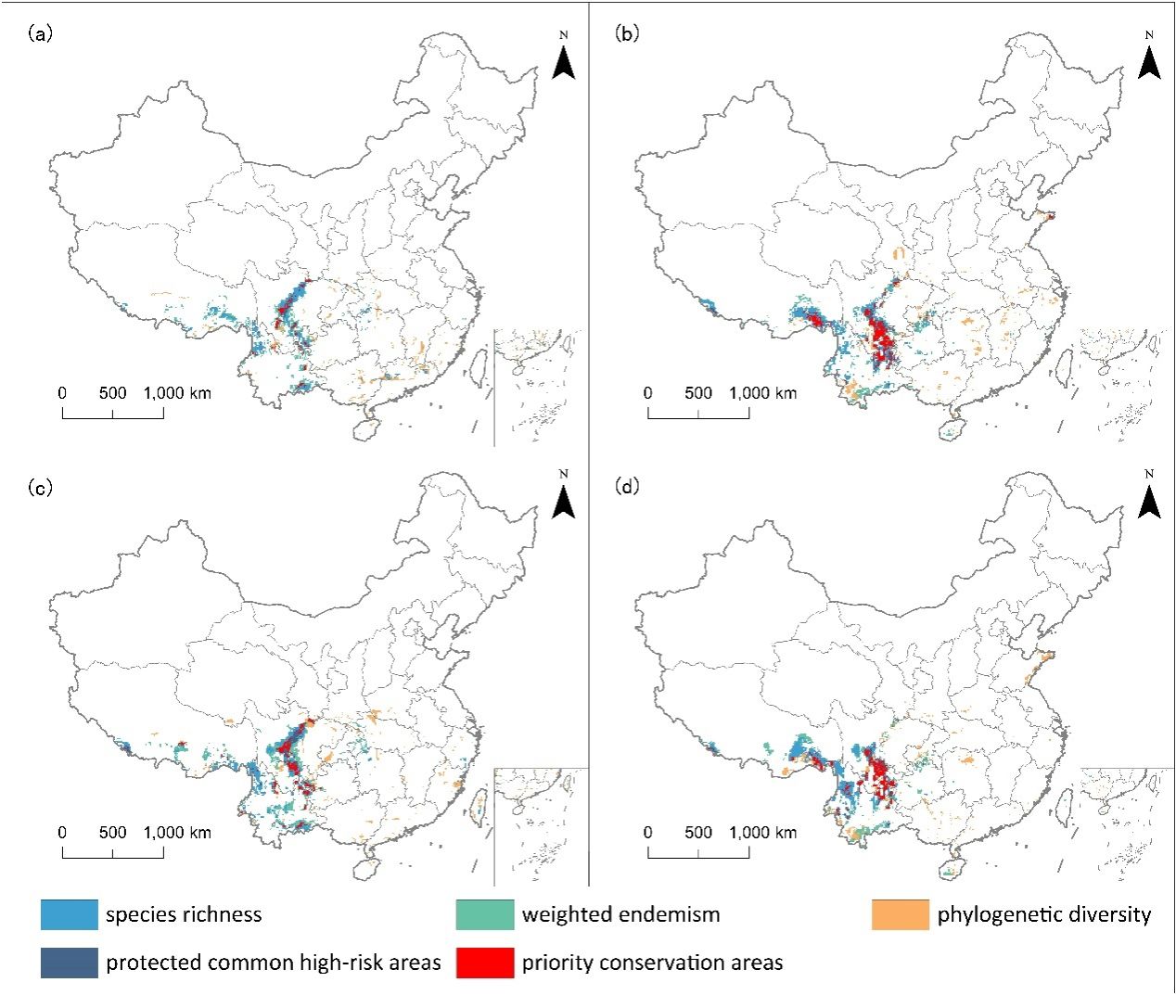 图5:未来中国杜鹃花的优先保护区分布。(a, c)分别为SSP2-4.5和SSP5-8.5情景下的平均气候态,(b, d)分别为SSP2-4.5和SSP5-8.5情景下的极端气候事件。