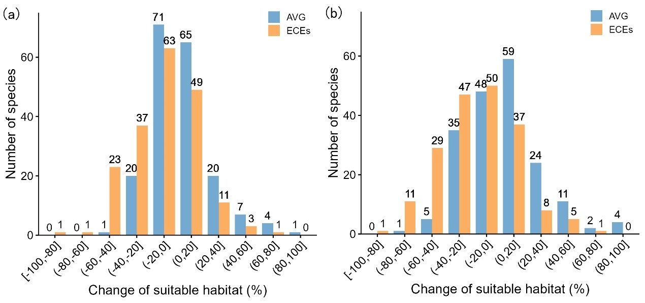 图2:未来(2071-2100年)在平均气候态(AVG)和极端气候事件(ECEs)下,189个杜鹃花物种潜在适生区变化的分布。(a,b)分别表示SSP2-4.5情景和SSP5-8.5情景。