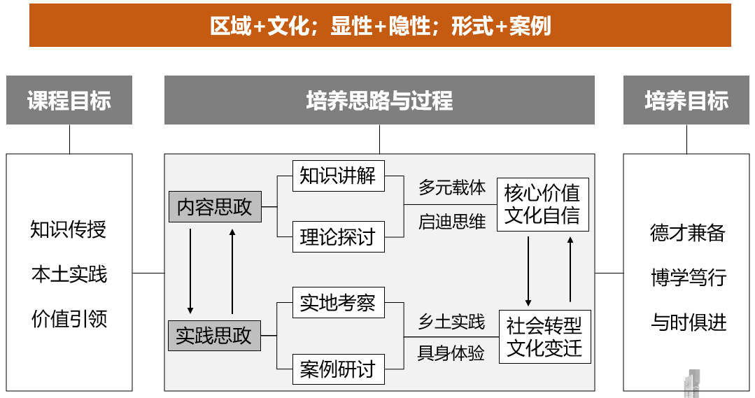 文化与思政相融。课程基于中国数千年文化元素和文明积淀,结合地域特征,广泛举例扎根祖国大地的思政案例,从“讲好中国故事、发出中国声音、总结中国经验和理论、建立文化自信”的角度,培养学科使命感和爱国情怀。