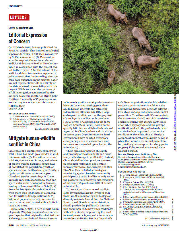 Duo Yin, Zhenjie Yuan, Jie Li, Hong Zhu*. Mitigate human-wildlife conflict in China [J].Science, 2021, 373 (6554), 500-501. DOI: 10.1126/science.abj8766.