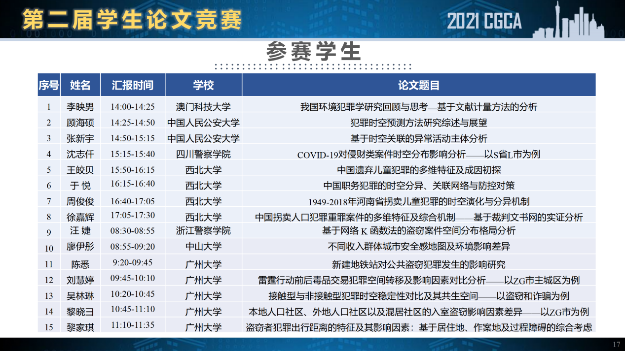 第二届学生论文竞赛在5号下午和6号上午举行,柳林教授、周素红教授、李钢教授、陈鹏副教授、刘大千博士担任汇报评委,陈鹏副教授和徐冲博士共同主持了本次竞赛。来自澳门科技大学、中国人民公安大学、四川警察学院、西北大学、浙江警察学院、中山大学和allwincity万象城官方网站等高校共15名学生汇报了自己的研究成果。