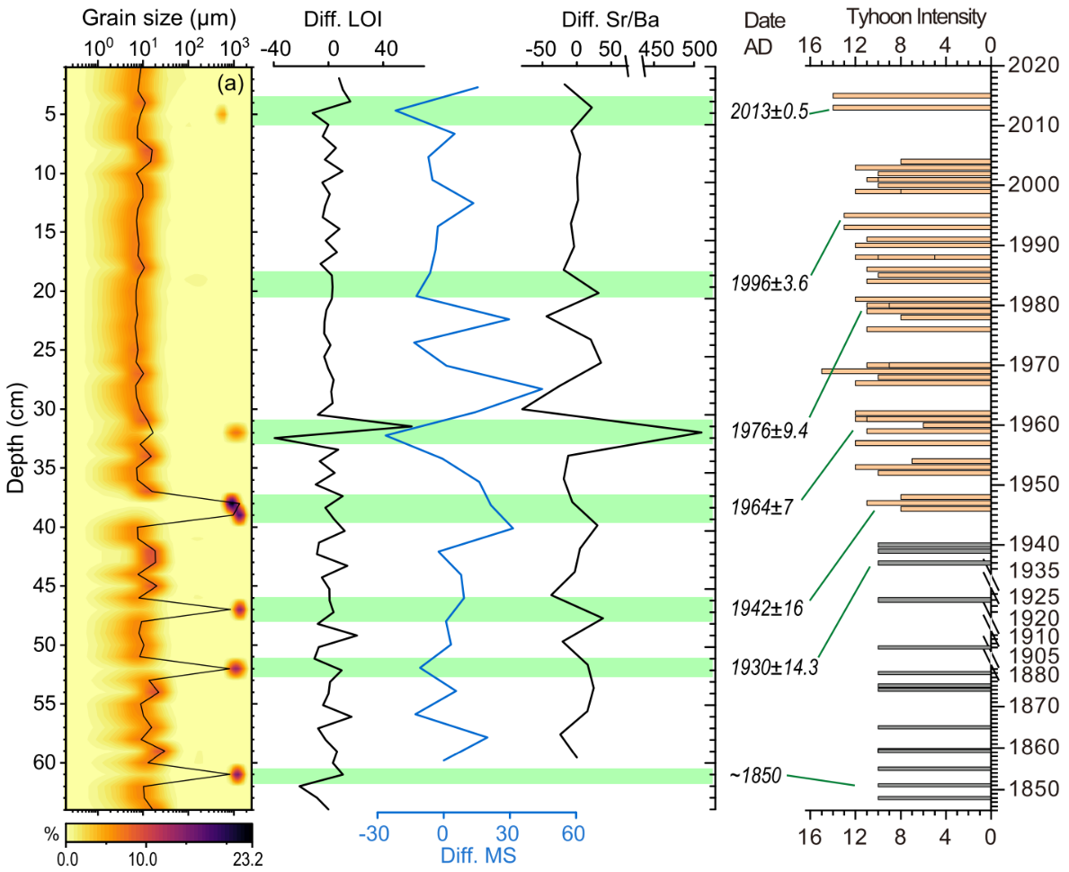 在此背景下,allwincity万象城官方网站气候与环境变化研究中心冼汉标博士与合作导师董旭辉教授以及丹麦奥胡斯大学的合作者Erik Jeppesen教授等,对采自粤东汕尾品清湖的沉积柱开展了高分辨率的粒度、年代学、磁化率、地球化学元素等分析,并结合近现代的器测数据和文献记录,共同揭示了潟湖中台风事件层的沉积特征及近170年来在粤东汕尾地区台风活动的规律。同时,综合品清湖周边历史海图资料与历史卫星图像,探讨了海岸地貌动态演化(尤其是海岸工程的建设)如何影响沿海潟湖沉积对台风事件的响应。