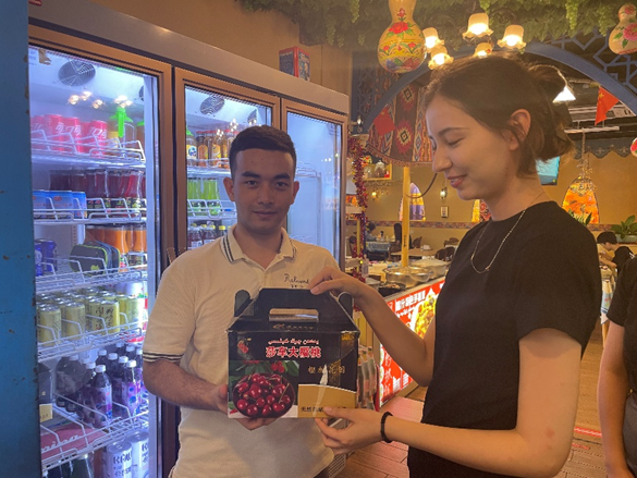 (左:艾克拜尔江 吐尔洪,“馕来了”品牌创始人;右:学院校友专访小组成员 热依沙 热依木江)