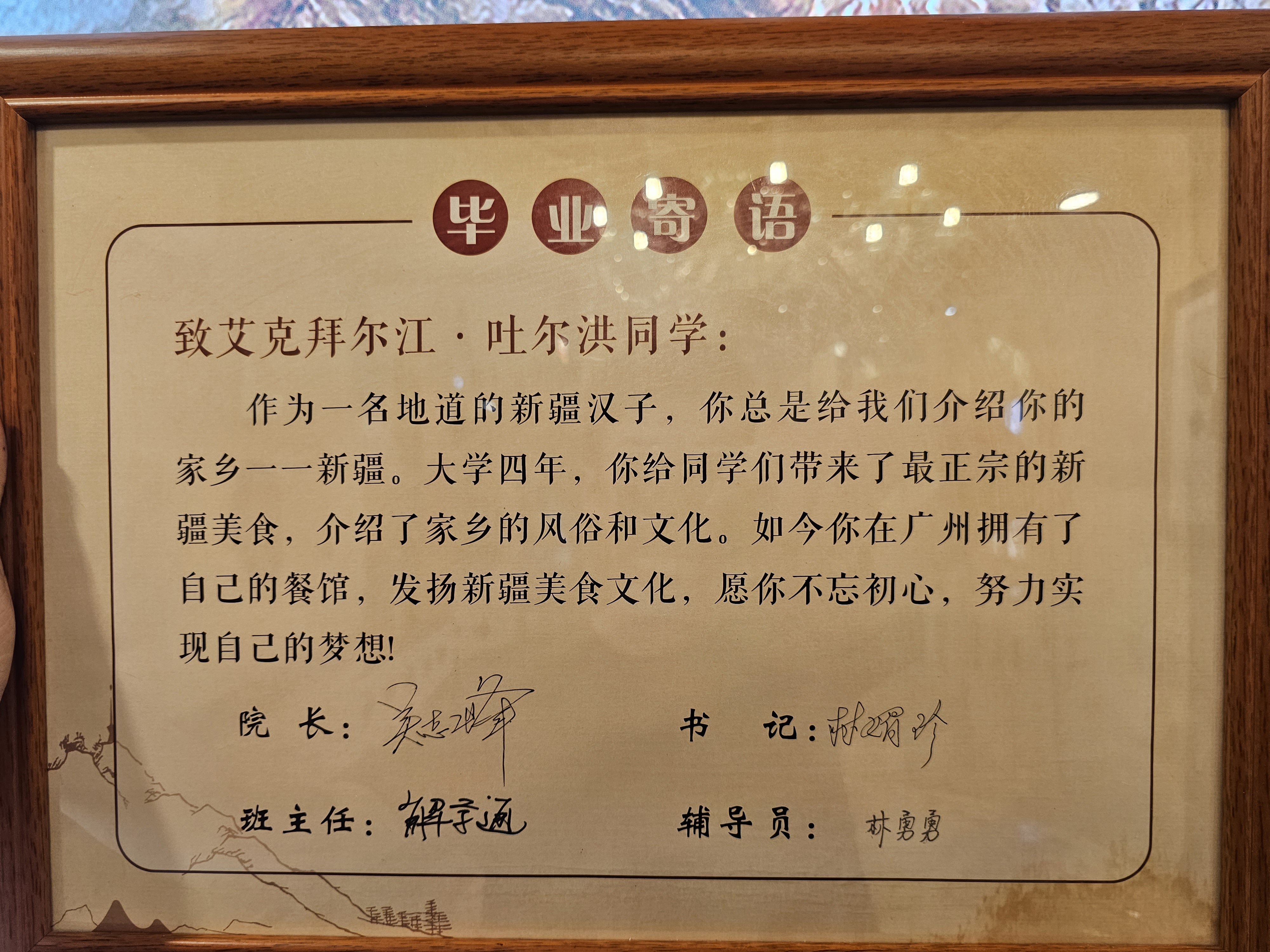 当时也犹豫过是否是回家乡工作,因为家人其实一直想让我回去就业,最后还是选择了创业,我认为首先还是要努力,坚持很重要。很早之前我就有想过要做新疆的餐饮,是在大一的第二个学期就有想过,但当时家里不同意。其实现在回想起来,当时家长的不同意也是对的,因为当时我把创业想的很简单,要是当时就开始创业的话也会有很多因素导致创业失败,例如由于还在上学,可能会精力不够。所以我在大四的第二个学期重拾创业的想法,再继续出发。老师的帮助也很大,大四刚开店时,当时的毕业论文指导老师马凌老师,她很支持我。当时是什么原因能够坚持下来,也是我身边的人,一直在鼓励,包括老师们都一直鼓励我坚持下去,鼓励我要坚持做好、做出特色和品牌,因为这个事情很有意义。
