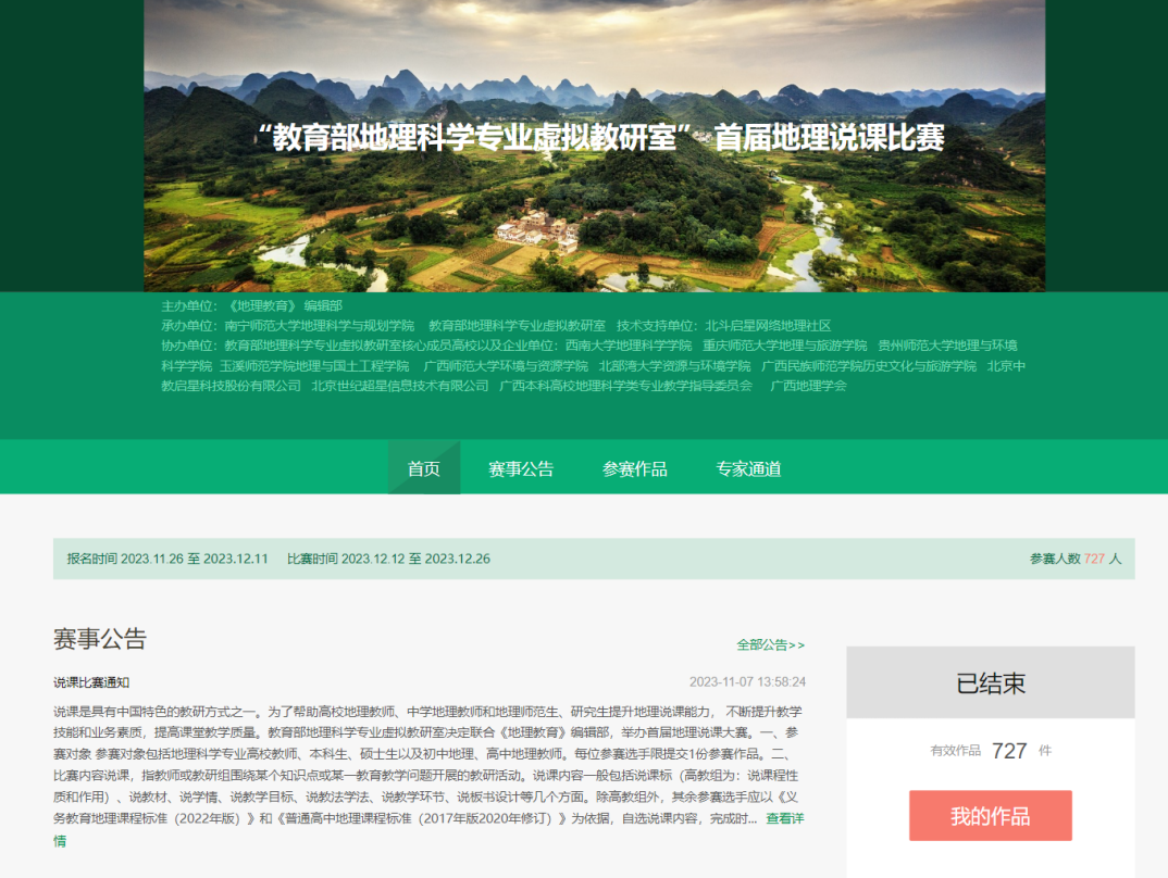 2024年1月12日,教育部地理科学专业虚拟教研室联合《地理教育》编辑部和北京中教启星科技股份有限公司北斗启星网络地理社区举办的首届地理说课大赛获奖名单公布。本次比赛共收到来自全国各地中学教师、高校师生的作品744件,经国内地理教育专家、学者评审,共评出一等奖80份,二等奖151份,三等奖231份,优秀奖282份。