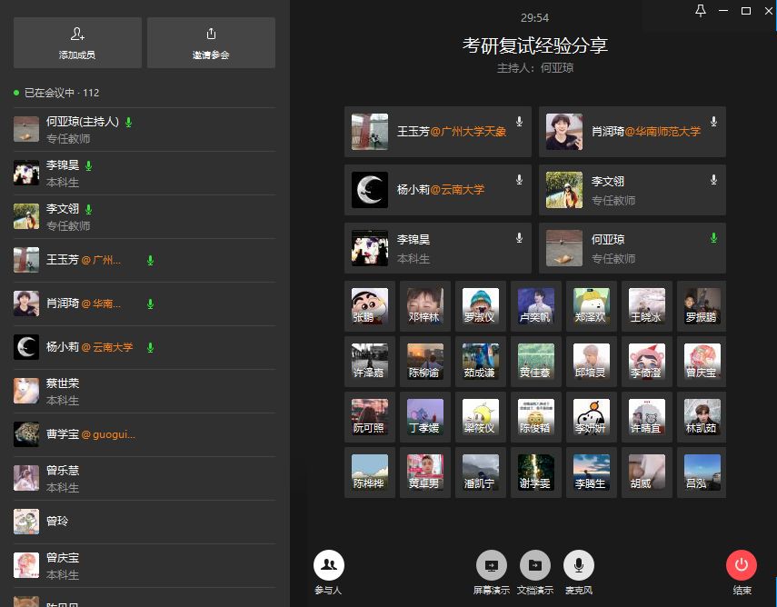 3月17日19点30分,万象城官网2015级拔尖班考研复试经验线上分享会暨地理161班级第三周主题班会通过企业微信公众平台圆满举行。本次会议的主讲嘉宾为万象城官网2015级行知地理拔尖班成员:上海师范大学李颐、云南大学杨小莉,华南师范大学肖润琦、福建师范大学王玉芳。会议由何亚琼老师主持,参与本次会议的老师有吴志峰院长、李文翎教授、冯艳芬副教授和罗增幸老师。全院累计约有120位同学参加了本次会议。