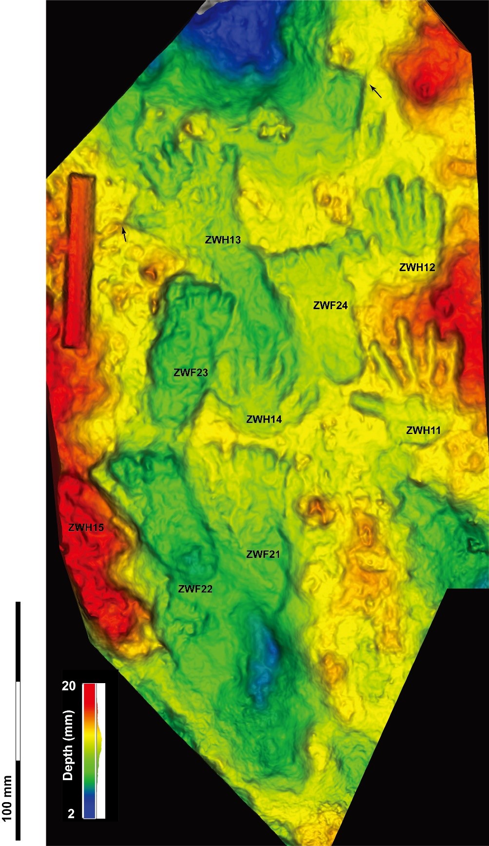 时间回到201810月,在参加第二次青藏高原综合科学考察研究的过程中,章典教授、王蕾彬博士、研究生王晓晴在拉萨市堆龙德庆区邱桑温泉附近的古泉华沉积(海拔约4060米)上发现了一组古人类手脚印,包含5个手印和5个脚印(图2)。在团队成员对手脚印拍照、测量,并在手脚印附近及其所处钙华层进行取样的基础上,章典教授团队联合世界顶级足迹学家、英国伯恩茅斯大学的Matthew R. Bennett教授团队,以及著名铀系定年专家、西安交通大学的程海教授团队分别从形态学和年代学两个方面对这些手脚印进行研究,此次发表的文章即为该国际团队历三年打磨之结晶。