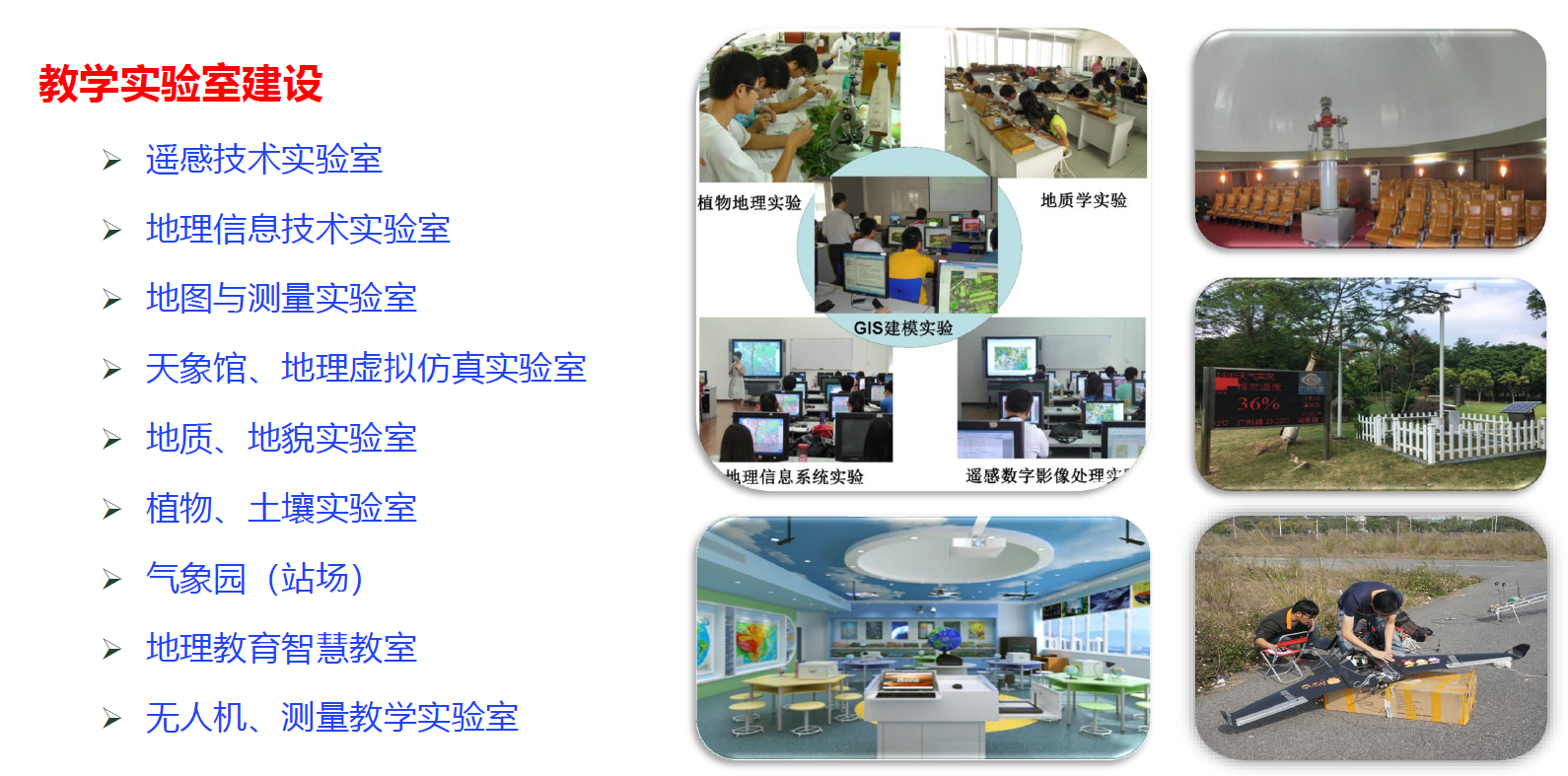 专业教学依托allwincity万象城官方网站资源环境与区域规划实验室,实验室2008年获批校级实验教学中心,2016年被批准为省级实验教学示范中心立项建设。实验室用房面积约2500平方米,仪器设备价值约2000万元。现下设地质地貌、植物地理、土壤地理、地理信息技术、天象与虚拟现实、地图与测量、国土与城镇规划、智能化物业管理、交通与物流信息技术等功能实验室,各实验室教学和实验仪器设备及成果达到省内领先或国内先进水平,可满足学生专业课程的实践培养。