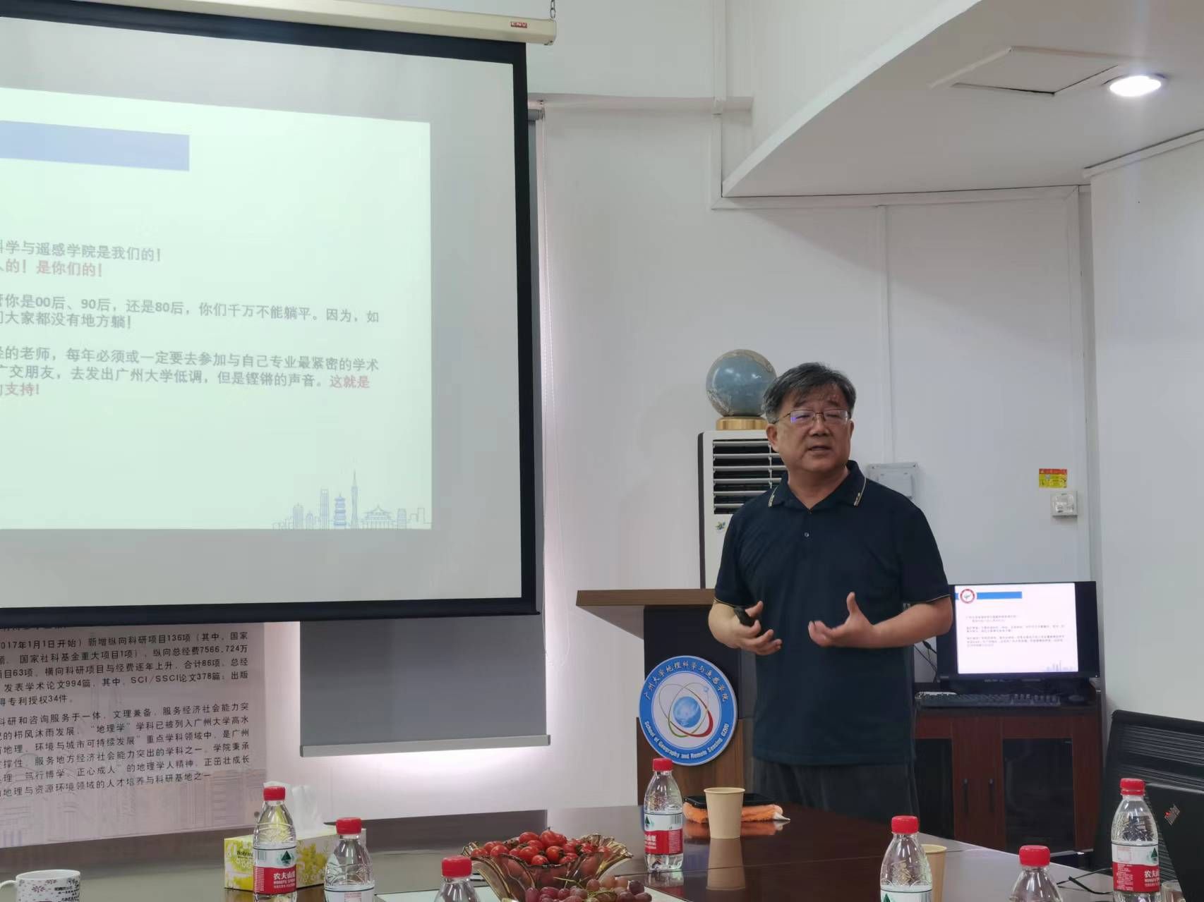 在青年教师报告之前,朱竑教授为全院带来《广大地理学的现状与未来》的精彩报告。报告从课题论文数量、问题与不足等方面展开。鼓励学院老师们在加强院内合作的同时也应该每年参加与自己专业最紧密的学术会议,提高与外校合作的频率,形成良好的交流机制,最后强调每位老师都应把自己和学院的共同成长紧密联合在一起。