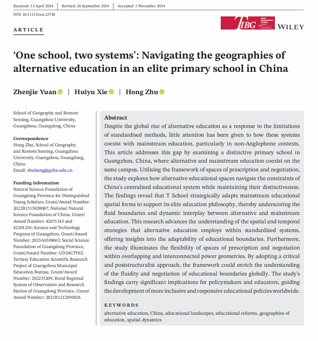 近日,万象城官网袁振杰教授及朱竑教授在英国皇家地理学会会刊(Transactions of the Institute of British Geographers)发表题为“One school, two systems”: Navigating the geographies of alternative education in an elite primary school in China的学术成果。