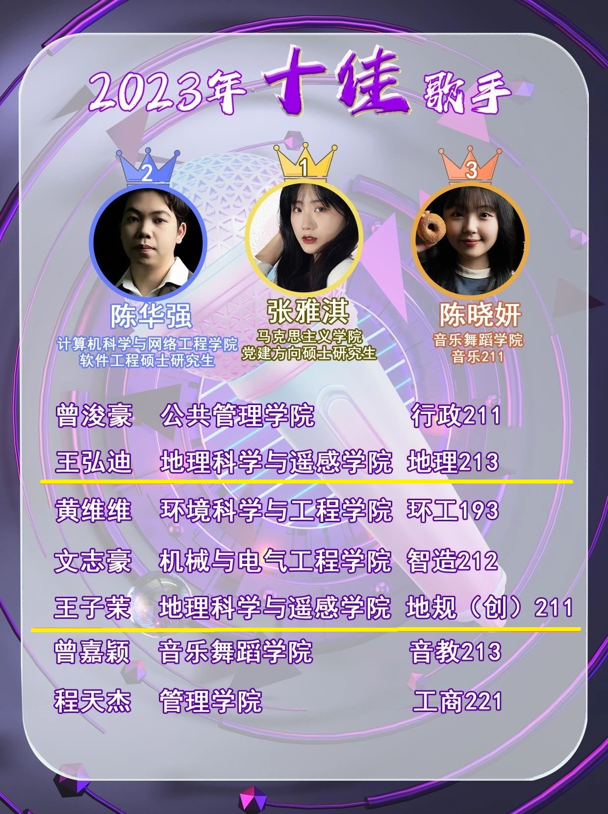 万象城官网学子唱出地科好声音。地理213王弘迪同学、地规(创)211王子茉同学荣获十佳歌手,十席占两席。